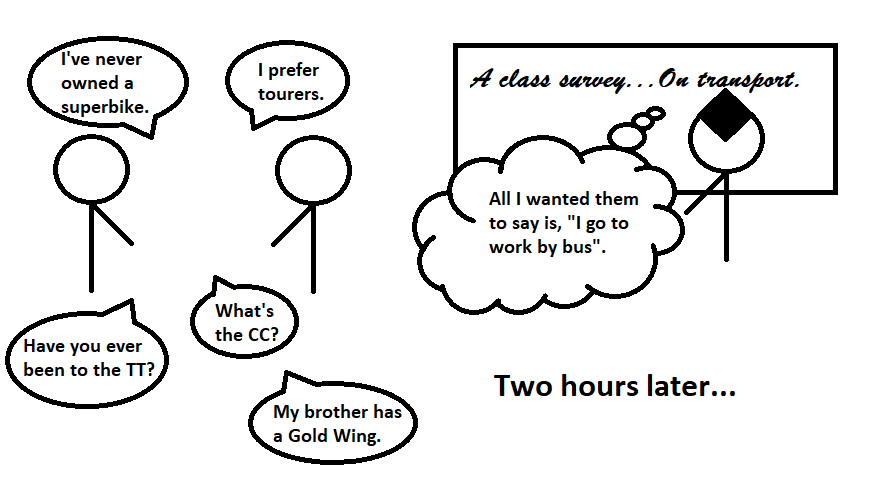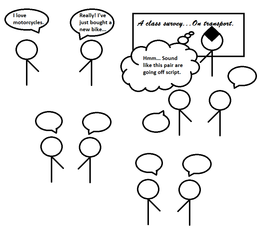 Class surveys promote interactive communication, give opportunities to consolidate language, allow students to personalise their responses and go beyond typical utterances to extend their discourse further. A simple class survey could be performed with a beginner class; the language is provided by the teacher and interaction rarely shift beyond the boundaries of expected adjacency pairs. However, the same class survey might also be performed by a more proficient cohort as a springboard for less predictable interactive communication. I hasten to add that both the beginner and more proficient user may seek to extend their utterances when their interest is piqued, e.g., two motorcycle enthusiasts, the first being a beginner and the second an intermediate user of English, will almost certainly wish to say more to their peers when promoted with questions from a class survey on modes of transport. The difference being the former may rely more on interlanguage, paralinguistic and other nonverbal features to bolster their message.